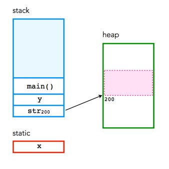 14 str = malloc(100*sizeof(char)); // create heap storage (a contiguous block) and assign its address to str